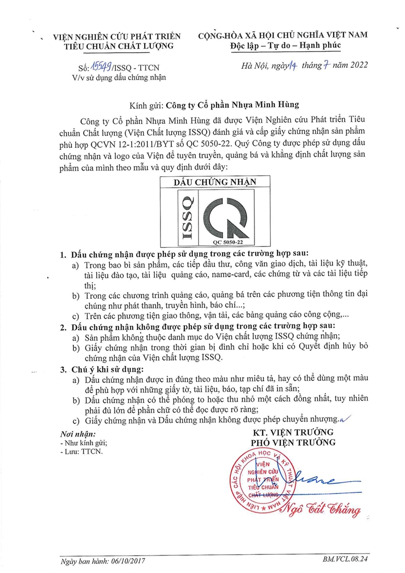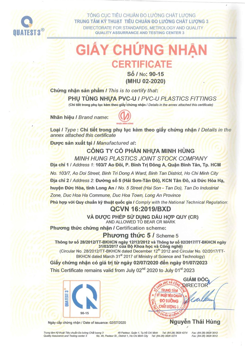 Giấy Chứng Nhận Hợp Quy phụ tùng nhựa uPVC do Bộ Xây Dựng cấp