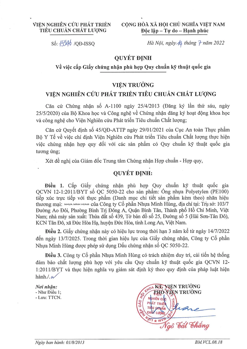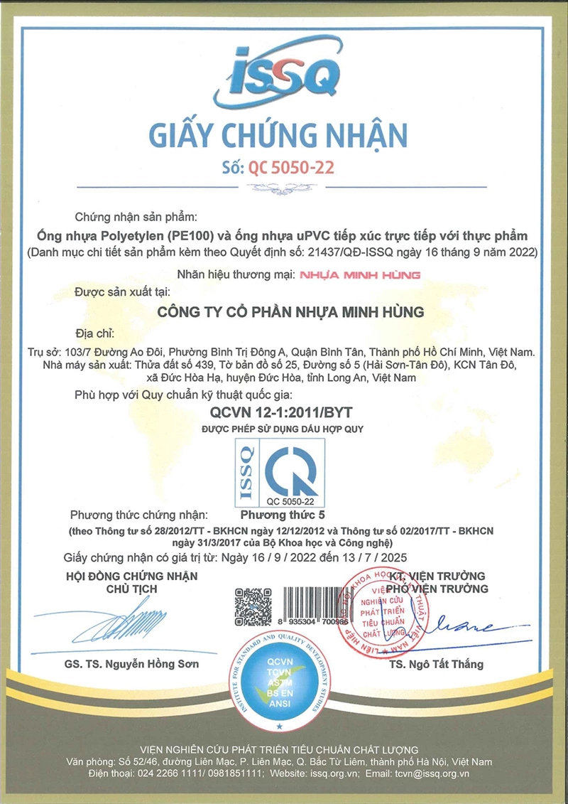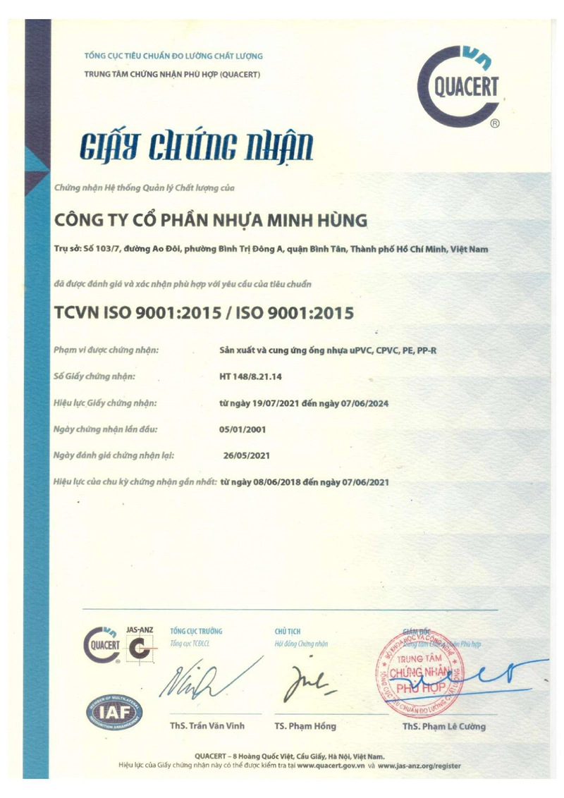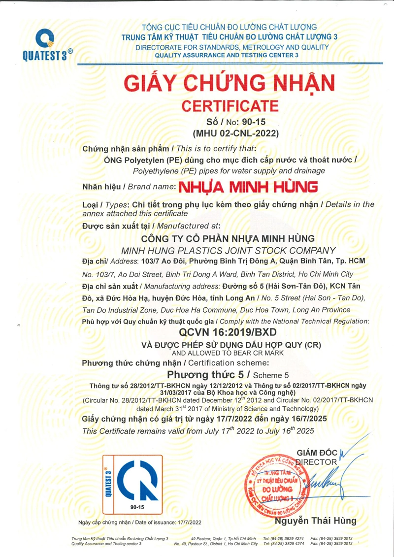 Giấy Chứng Nhận Hợp Chuẩn ống PE dùng để cấp nước
