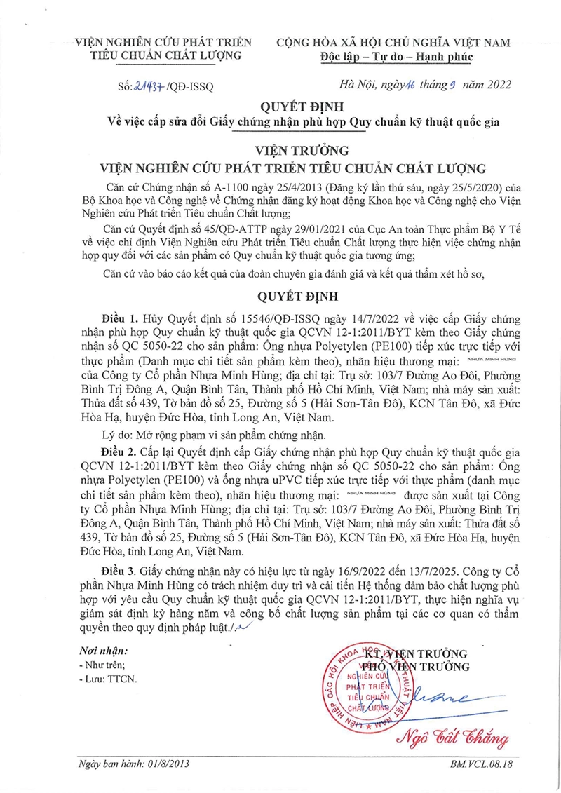 Giấy Chứng Nhận Hợp Quy cho sản phẩm ống PE do Bộ Xây Dựng cấp